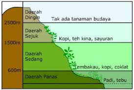 Jenis tanaman yang tumbuh: kopi, teh, kina, dan sayuran. - Daerah dingin, ketinggian di atas 2.500 m dengan temperatur kurang dari 11,1°C Tidak ada tanaman budidaya, yang dapat tumbuh adalah lumut.